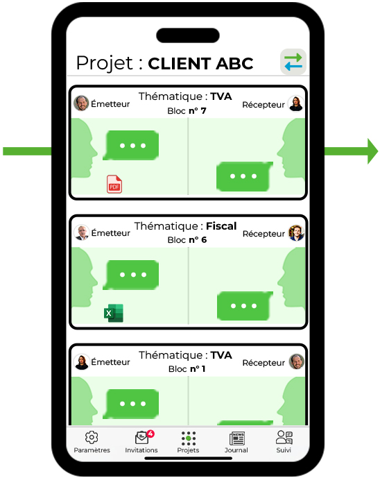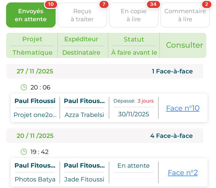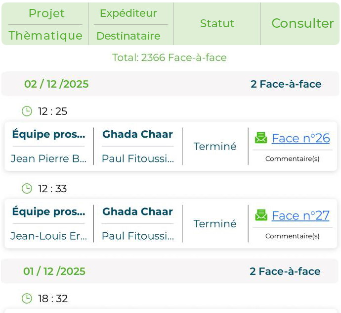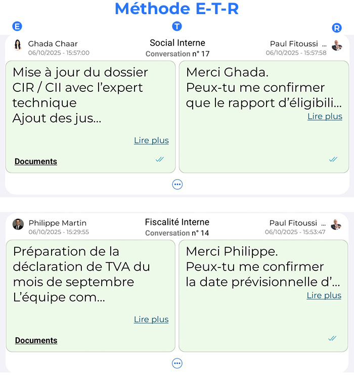 Chaque échange devient un bloc Face-à-Face structuré en méthode ETR rangé par métier et totalement traçable. La méthode E-T-R : Émetteur > Thème > Récepteur.