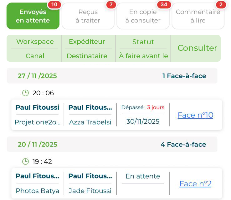 Le flux horizontal Face2Faces structure chaque échange dès l’envoi. Le travail devient clair, traçable et les équipes produisent sans perte d’information.